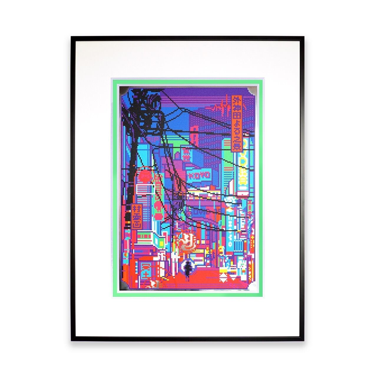 It depicts the electric town of Akihabara at night. Akihabara was born out of the postwar black market and developed as the center of electrical products and otaku culture.