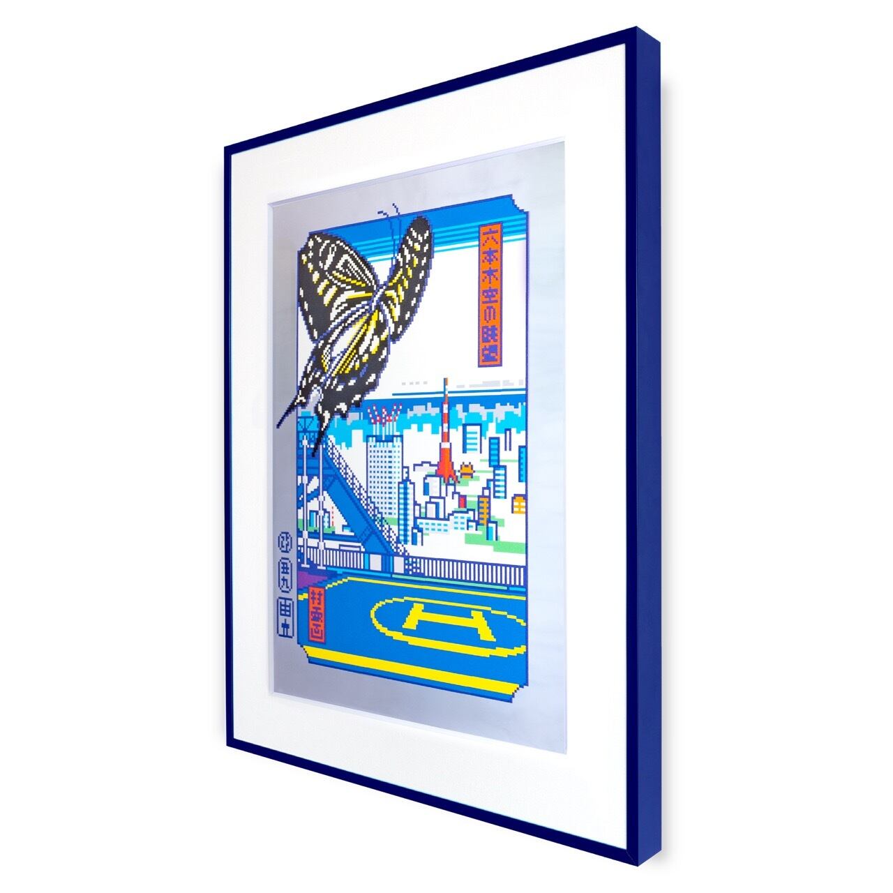 The large butterfly on the left is based on the artist's experience when he visited this location. The helipad on the Sky Deck is depicted in the close-up view, Tokyo Tower and Zojoji Temple in the middle view, and Tokyo Bay in the distance.