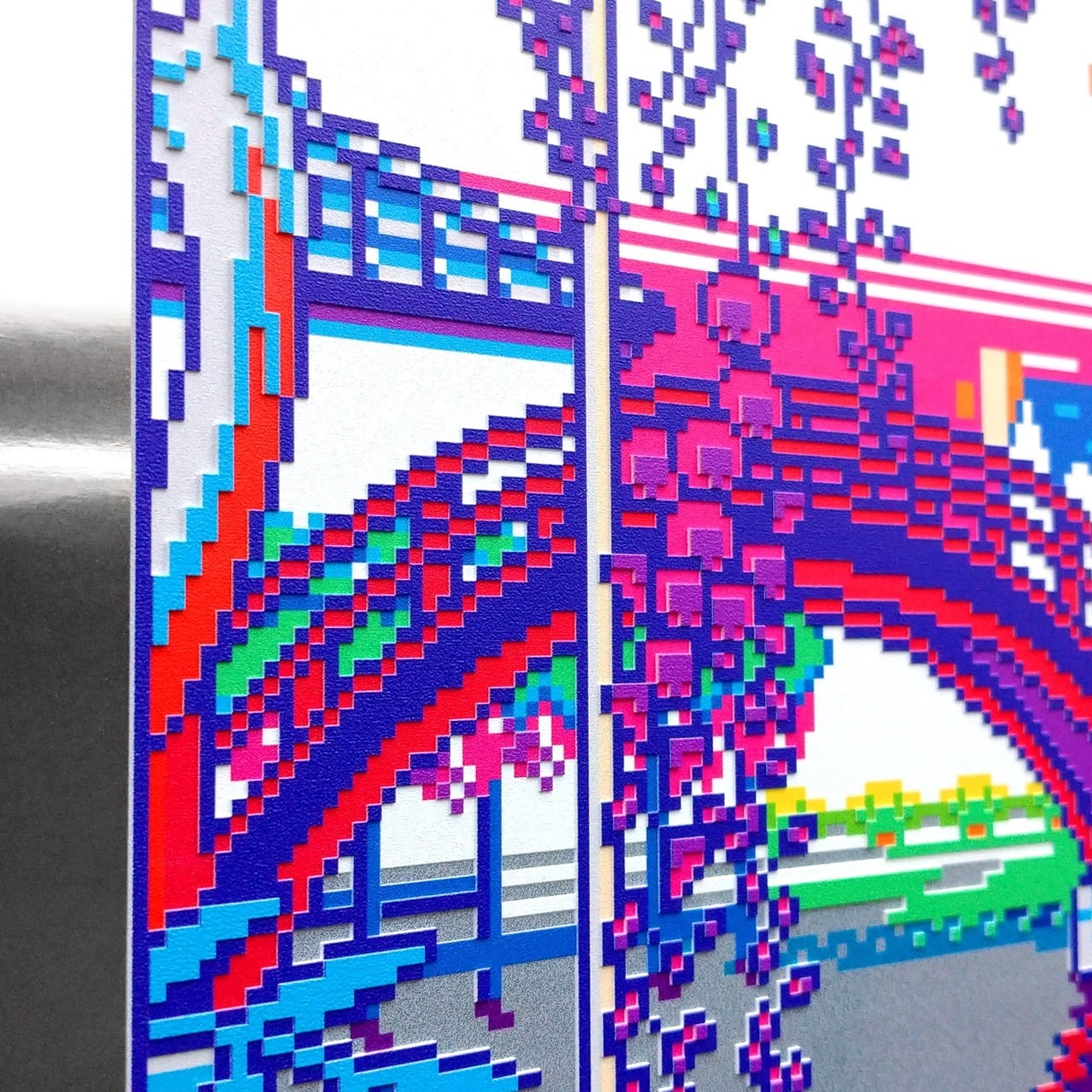 There are 2 versions of Hiroshige's "Kameido Tenjin keidai": a blue first-printing version under the drum bridge and a red second-printing version. This work is based on the first-printing version.