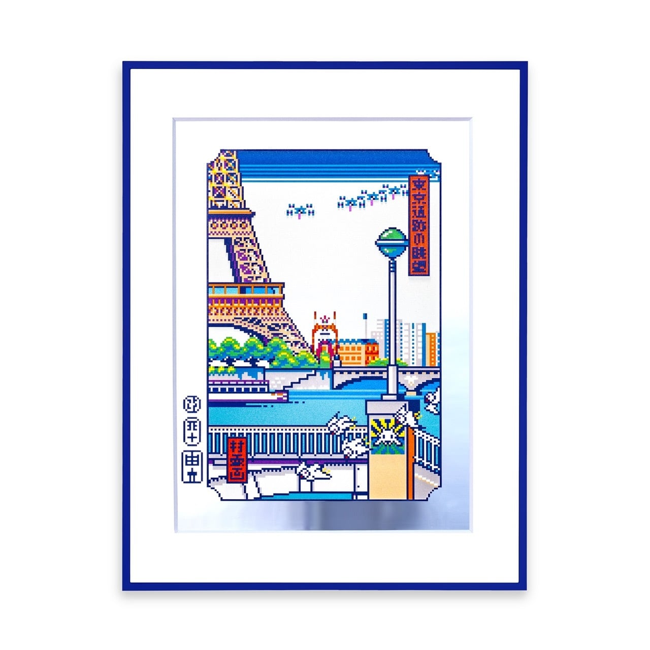 パリの「浮世ドット絵」3 作目です。タイトルは1918 年から1945 年まで存在した通りの名前「Avenue de Tokio」から名付けました。この通りの名前はパレ・ド・トーキョーの由来にもなりました。 近景の橋はセーヌ川に架かるドゥビリ橋で、インベーダーがボムッた作品を借景しています。また、セーヌ川を飛ぶカモメ(Mouette rieuse)とエッフェル塔は、広重の『芝うらの風景』からユリカモメ(東京都民の鳥)と澪標を重ねて、遠景には『シン・エヴァンゲリオン劇場版:||』パリ戦でのエヴァ8号機βとエヴァ44Aを引用しています。